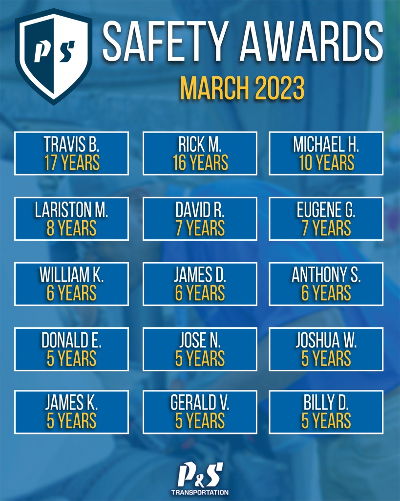 Congratulations to all of the drivers who received a Safe Driver Award for March 2023. These drivers and the consecutive years that these drivers have received this award are listed below. To receive the award, a driver must go a minimum of 1 year without an accident, cargo claim or loss time – work place…